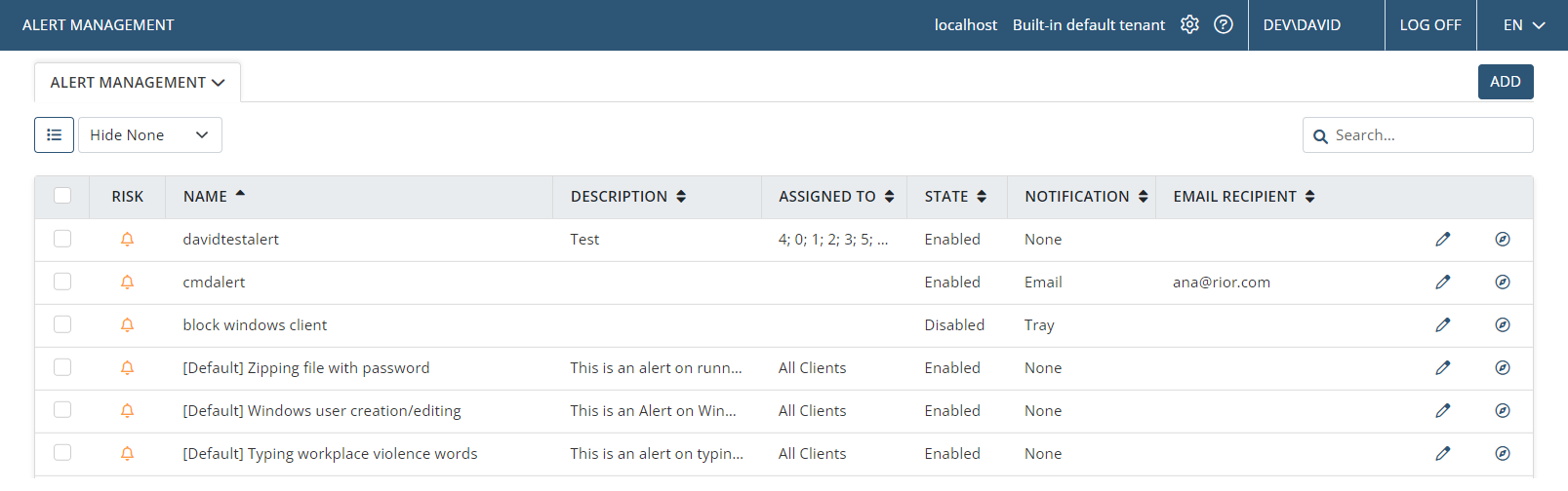 Aby znaleźć wymagany alert, można użyć pola Szukaj oraz listy rozwijanej opcji filtrowania (kliknij przycisk Ukryj: Brak, a następnie wybierz odpowiednią opcję z listy rozwijanej: Ukryj wyłączone / Ukryj domyślne / Ukryj włączone — a alerty zostaną odpowiednio przefiltrowane).