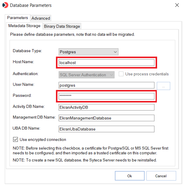 Uwaga: Jeśli używasz nowego hasła dla użytkownika postgres (różnego od tego na starym serwerze), również musisz je zmienić w aplikacji Database Parameters (DbSetupToolUI).