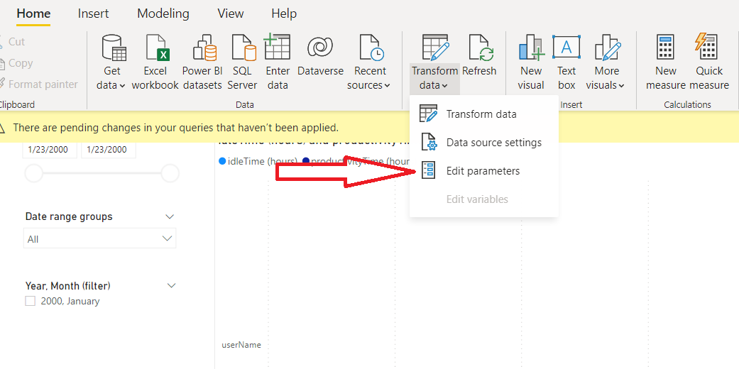 W otwartym szablonie raportu Power BI kliknij Przekształć dane > Edytuj parametry, aby otworzyć stronę Edytuj parametry.