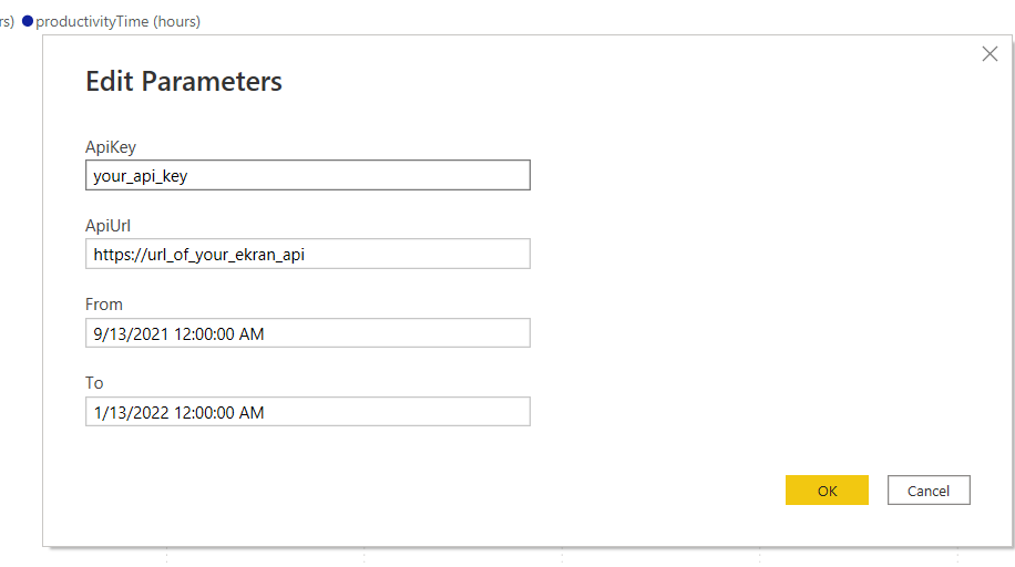 W razie potrzeby zmień wartości w polach From i To (pola te wykorzystywane są wyłącznie w zestawie danych User Productivity).