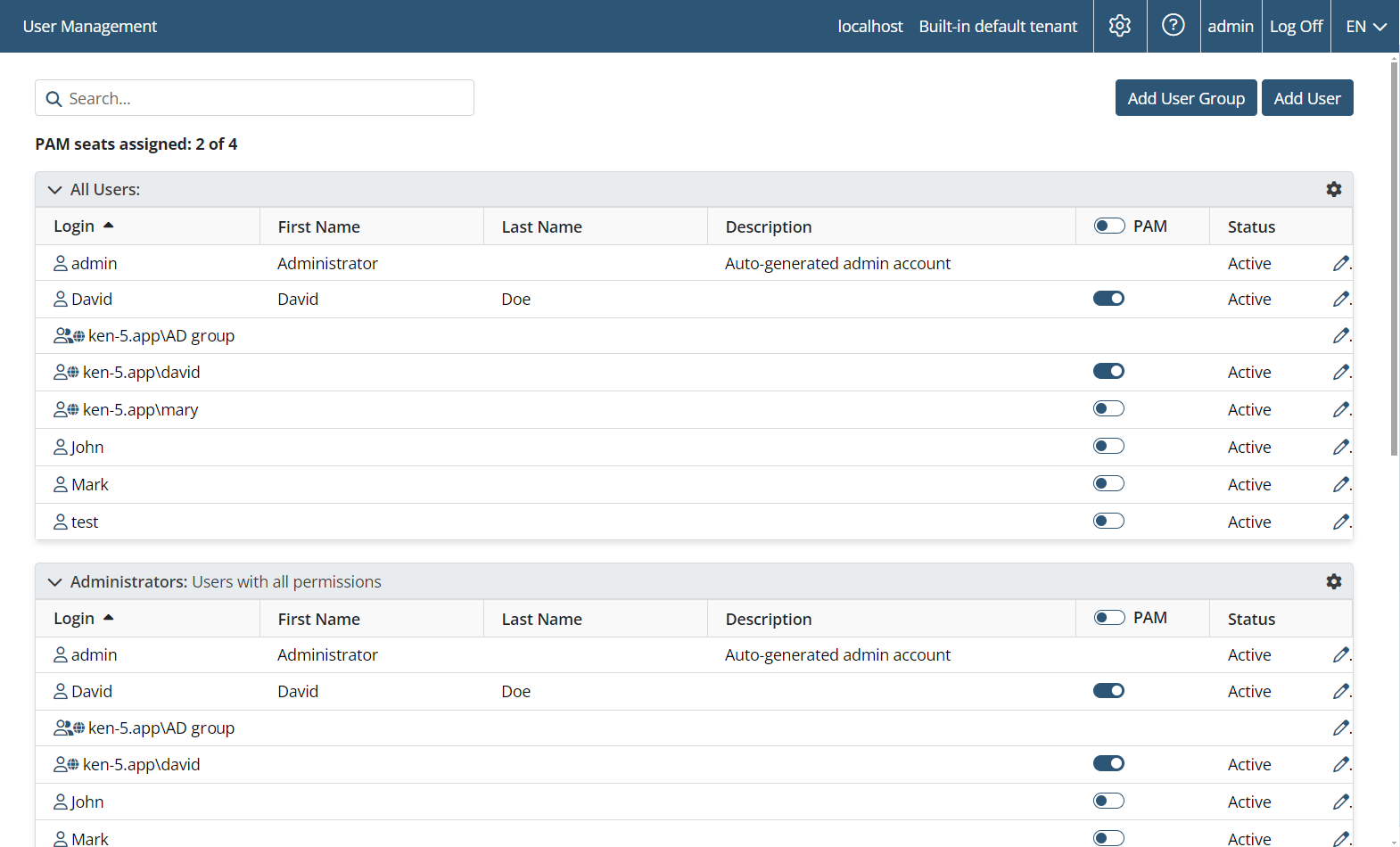 UWAGA: Konto administratora wbudowanego domyślnego tenanta (lub konto administratora dowolnego tenanta w trybie Multi-Tenant) nie może mieć przypisanej licencji PAM seat, ale nie potrzebuje jej, aby korzystać z funkcjonalności PAM.