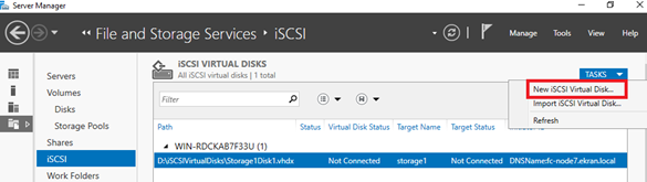 - W lewym panelu Menedżera serwera otwórz Usługi plików i przechowywania, a następnie otwórz stronę iSCSI, kliknij Zadania i wybierz Nowy dysk iSCSI.
