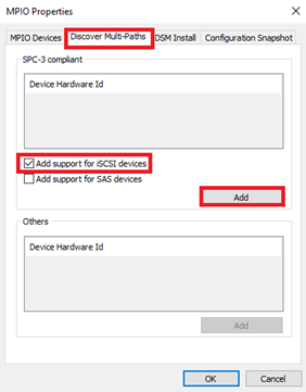 - Wybierz zakładkę Discover Multi-Paths, a następnie zaznacz pole wyboru Add support for iSCSI devices i kliknij przycisk Add.