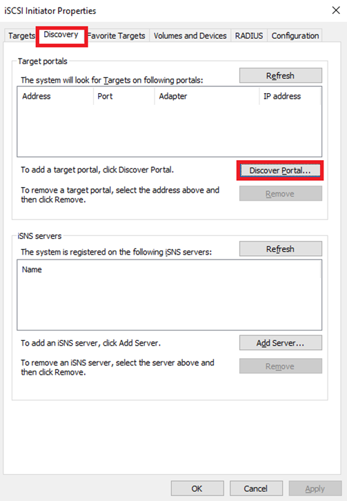 - W oknie iSCSI Initiator Properties wybierz zakładkę Discovery i kliknij Discover Portal.
