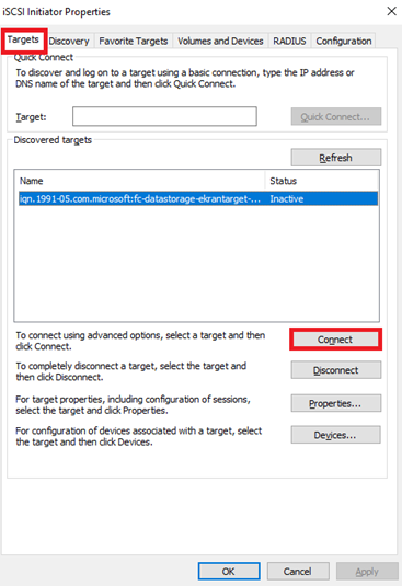 - W oknie iSCSI Initiator Properties wybierz zakładkę Targets i kliknij przycisk Connect.