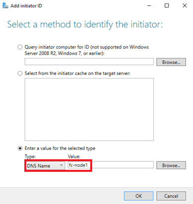 - Wprowadź adres IP lub nazwę DNS serwera, na którym utworzono wirtualne dyski iSCSI i cel iSCSI, a następnie kliknij przycisk OK.
