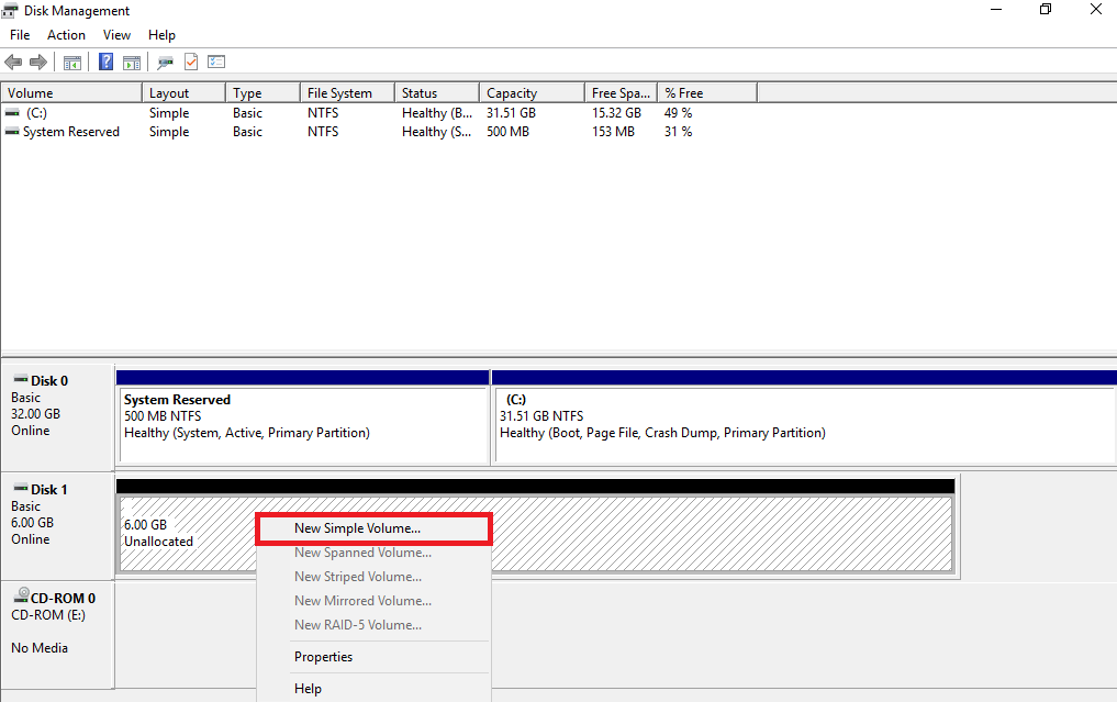 - Kliknij prawym przyciskiem myszy nieprzydzielone miejsce na nowym dysku, a następnie przejdź do końca, aby utworzyć nowy wolumin.