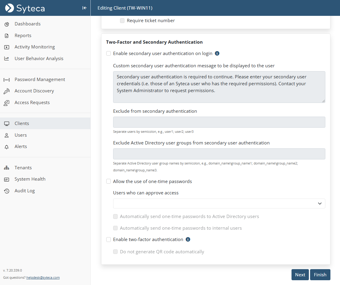 Aby włączyć dodatkowe uwierzytelnianie użytkowników dla agenta monitorowania Syteca dla systemów z rodziny Windows (lub wszystkich agentów w grupie agentów), wykonaj następujące kroki: