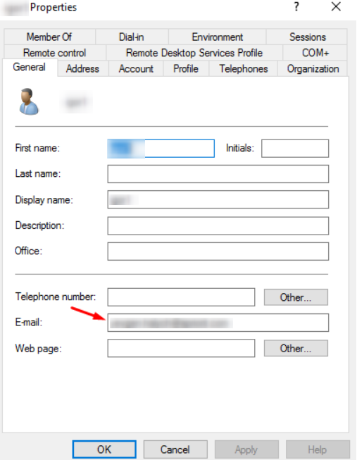 Zdefiniuj adres e-mail dla użytkownika w właściwościach użytkownika Active Directory.