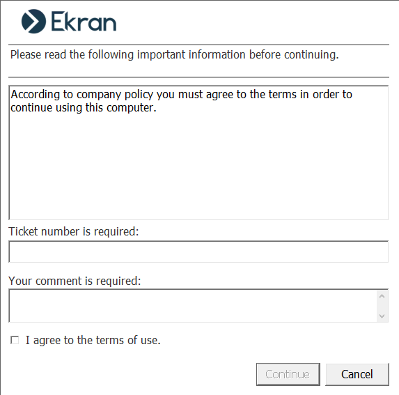 Za każdym razem, gdy użytkownik zaloguje się do komputera z Agentem Windows, dla którego aktywowano opcję wyświetlania dodatkowego komunikatu przy logowaniu, zostanie wyświetlone odpowiednie okno (z wszystkimi ustawionymi opcjami i domyślnymi treściami, jeśli nie zostały zmienione).