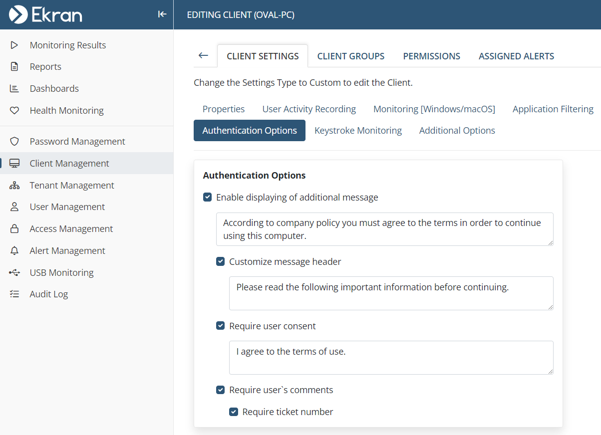 Na stronie „Edycja Agenta” (lub „Edycja grupy agentów monitorowania”), przejdź do zakładki Opcje uwierzytelniania i zaznacz pole Włącz wyświetlanie dodatkowego komunikatu w sekcji Opcji uwierzytelniania. Opcjonalnie dostosuj treść wiadomości, która ma być wyświetlana użytkownikowi (domyślna treść to: