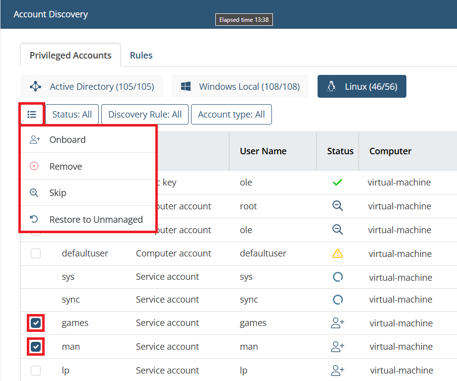 Przejdź do Account Discovery → karta Privileged Accounts.