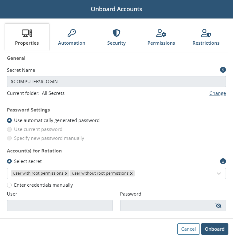Onboarding kont – dodawanie nowych sekretów kont w Password Management poprzez wprowadzenie wykrytych kont do skarbca, z wykorzystaniem następujących parametrów konta: