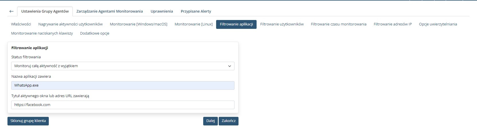 Dzięki funkcji filtrowania możesz elastycznie zarządzać zakresem monitorowania w Syteca. Wykluczenie aplikacji lub stron internetowych pozwala na lepsze dostosowanie systemu do wymagań organizacji, zapewniając jednocześnie precyzyjną i zgodną z polityką kontrolę aktywności użytkowników.