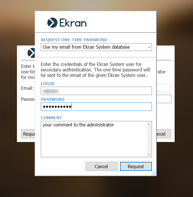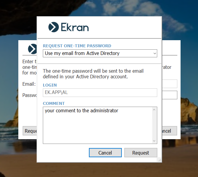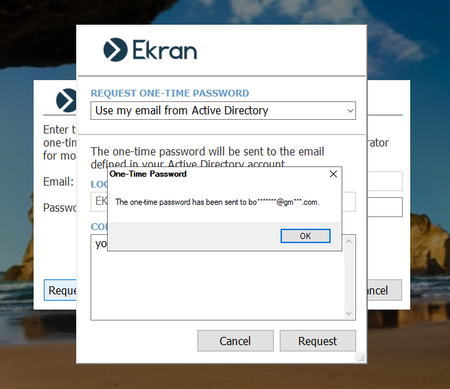 Jeśli pole „Automatycznie wysyłaj jednorazowe hasła do użytkowników Active Directory” jest zaznaczone, wyświetli się okno pop-up, w którym użytkownik musi tylko kliknąć przycisk „Poproś”.
