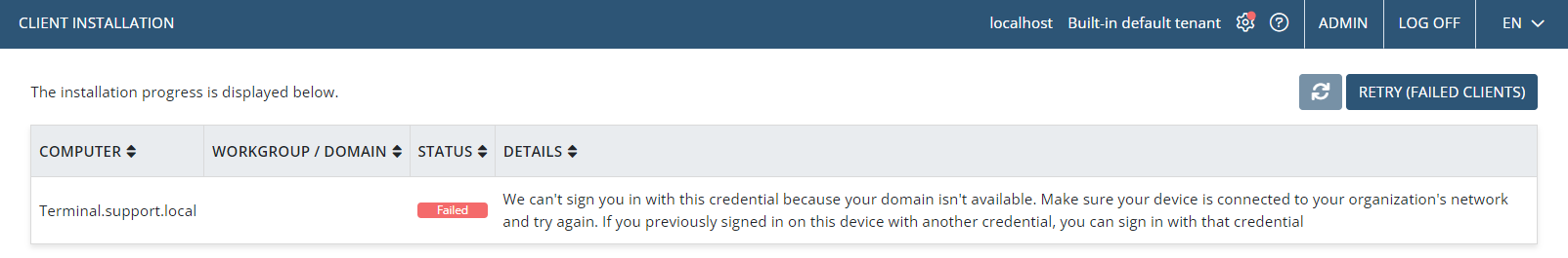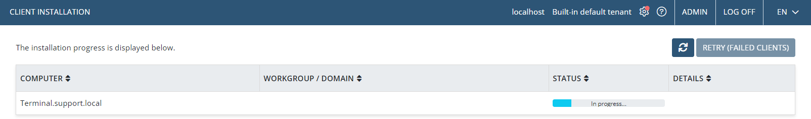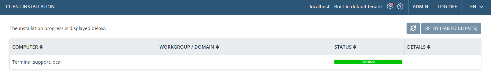 - Jeśli instalacja któregokolwiek agenta zakończy się niepowodzeniem, możesz kliknąć przycisk Ponów (nieudane instalacje), aby spróbować ponownie.