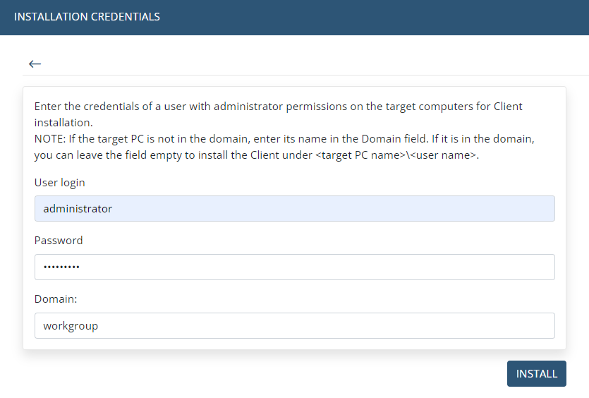 Uwaga: Jeśli pozostawisz pole Domena puste, wprowadzone dane zostaną użyte jako dane lokalnego użytkownika komputera docelowego, a agent zostanie zainstalowany pod kontem <nazwa komputera>\<nazwa użytkownika>.